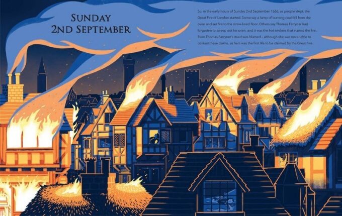 Lewis’s drawings take readers on a journey, from the single smouldering coal that falls out of the baker’s oven to the swirling clouds of ash that engulf the city and then in to the very heart of the fire itself. As the pages turn, you can witness London burning to the ground and then rebuilding again.